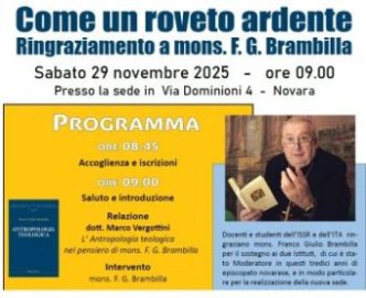 Sabato 29 novembre ore 09.00 presso la sede di via Dominioni 4, si terrà l'Inaugurazione dell'Anno Accademico 2025-26 "Come un Roveto ardente - Ringraziamento a mons. F. G. Brambilla" con la relazione del dott. Marco Vergottini "L'Antropologia teologica nel pensiero di mons. F.G. Brambilla". L'ingresso è aperto a tutti. Al termine si svolgerà la cerimonia di consegna dei Diplomi di Laurea conseguiti nel dicembre 2024 e nell'aprile 2025… >